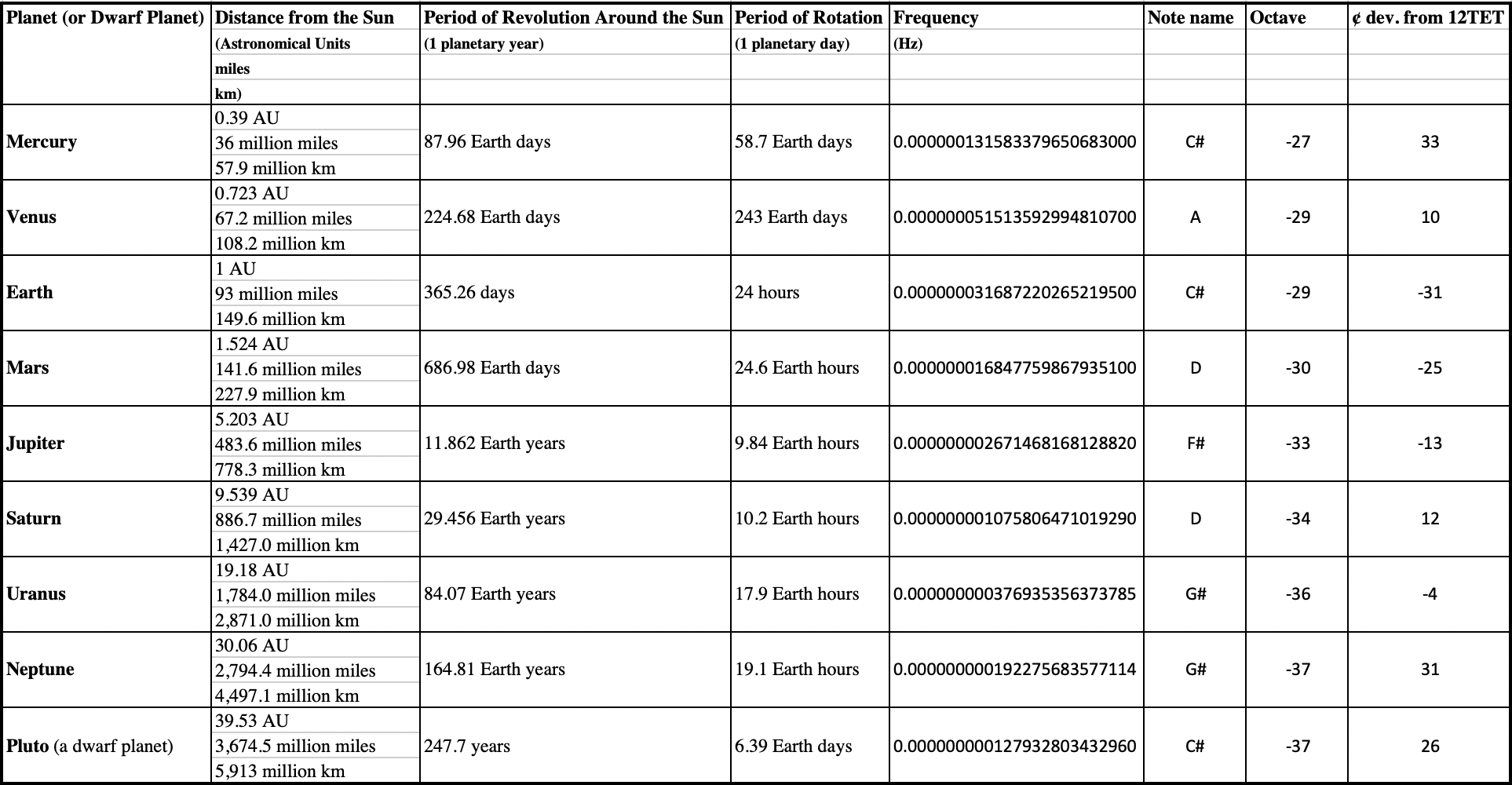 I started by converting the periods of rotation for the planets, converting them to frequencies and then to notes in the western musical scale. The conversion is by no means perfect and I unfortunately have no way to perform microtonal music (at least not easily).